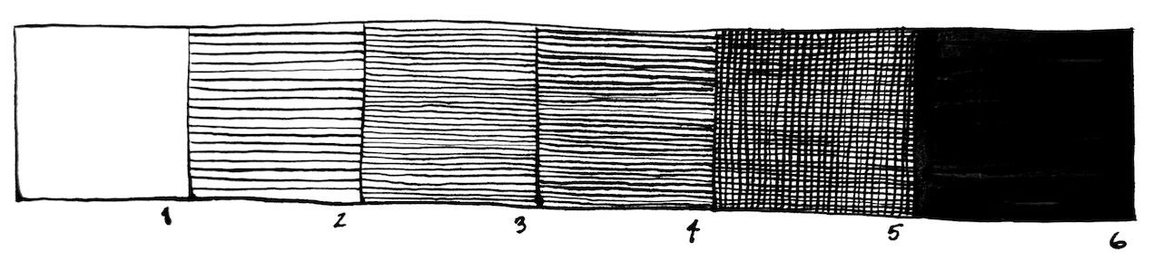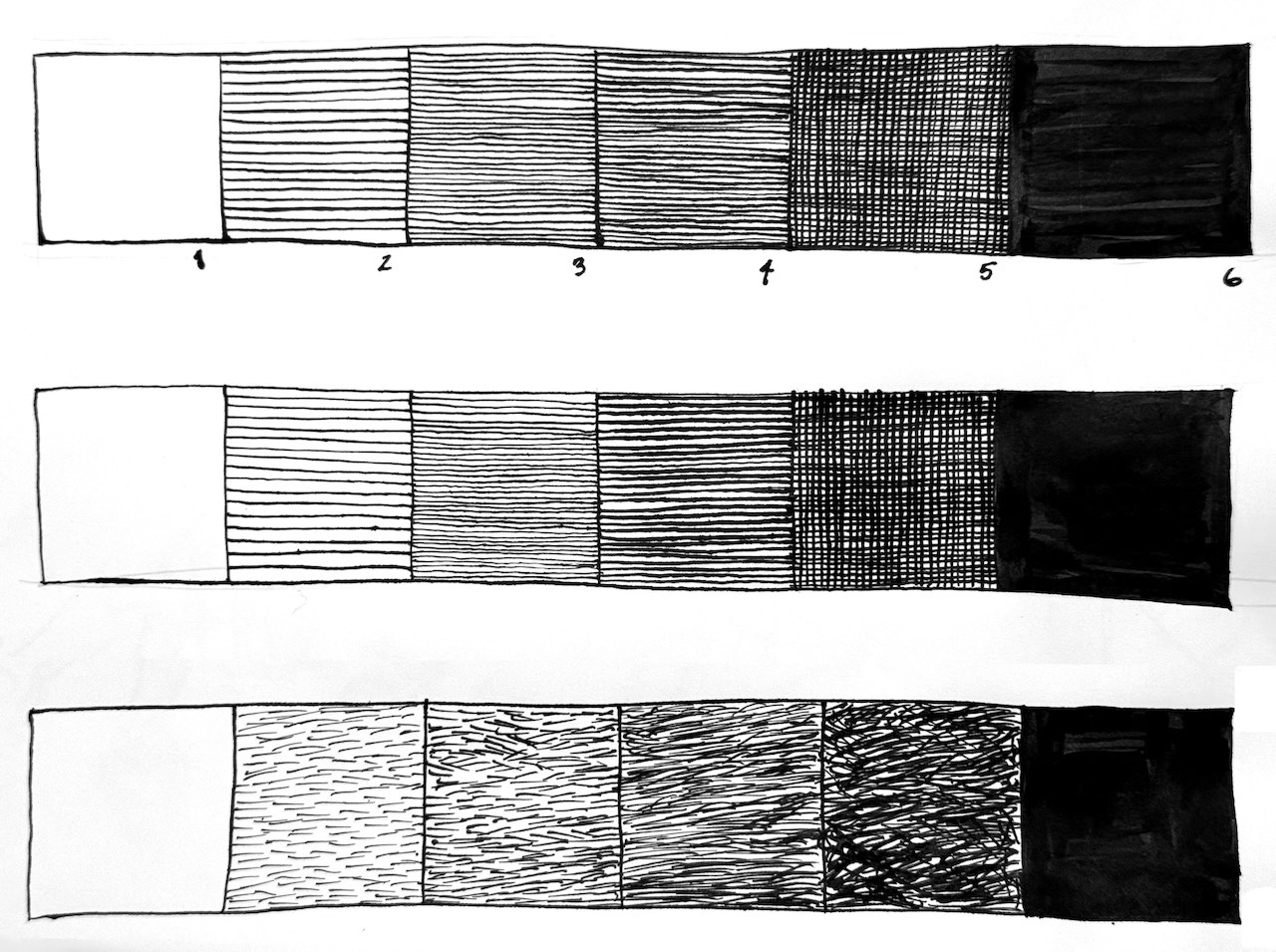 Try this exercise once a day for a week. Send lines in different directions. Use different tools—tech pen, dip pen, brush pen, whatever you’ve got. Notice how the same six tones feel different depending on the tool.