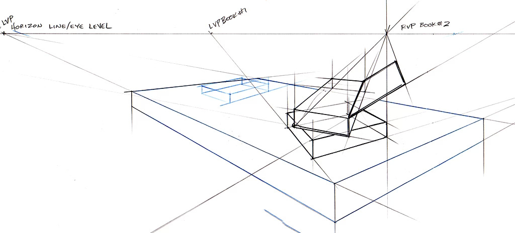 Vanishing Points: These are points on the horizon line where parallel lines appear to converge in perspective. In a one-point perspective, all lines converge to a single point; in a two-point perspective, they converge to two. If your head is dramatically tilted, you have to step up to a three-point perspective, and yes, your drawing gets much more complex. 3PT is rarely necessary unless your shot is about being high above or far below the focus.