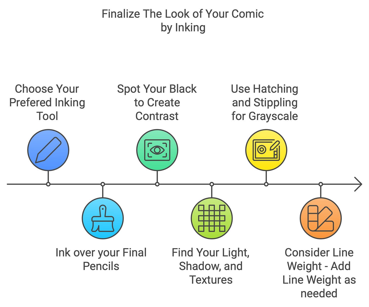 Why it's essential: Inking provides clarity and contrast, giving your comic a professional, polished look. It's also where you can emphasize light, shadow, and texture. You use hatching and stippling to simulate grayscale. If you stick to black and white, your lines will be sharper, and your coloring in step 11 will be easier.