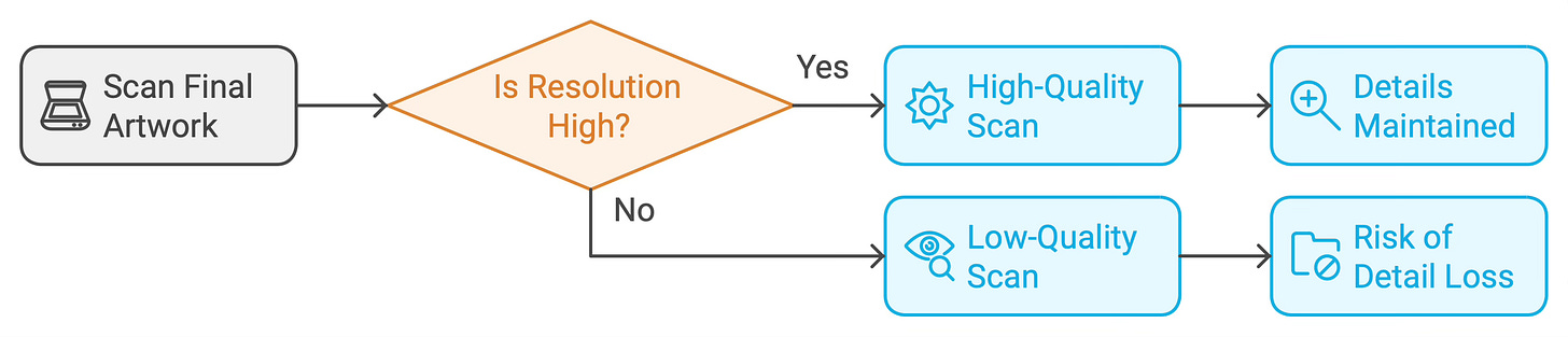 Why it's essential: High-quality scans ensure that the details and integrity of your art are maintained. This is the step that makes sure your work looks crisp and clean when reproduced.