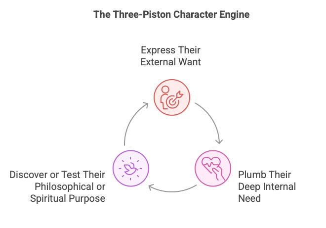 Example: Iron Man wants to protect the world with technology (external want), needs validation of his self-worth (internal need), but must discover the purpose of true sacrifice (philosophical purpose).